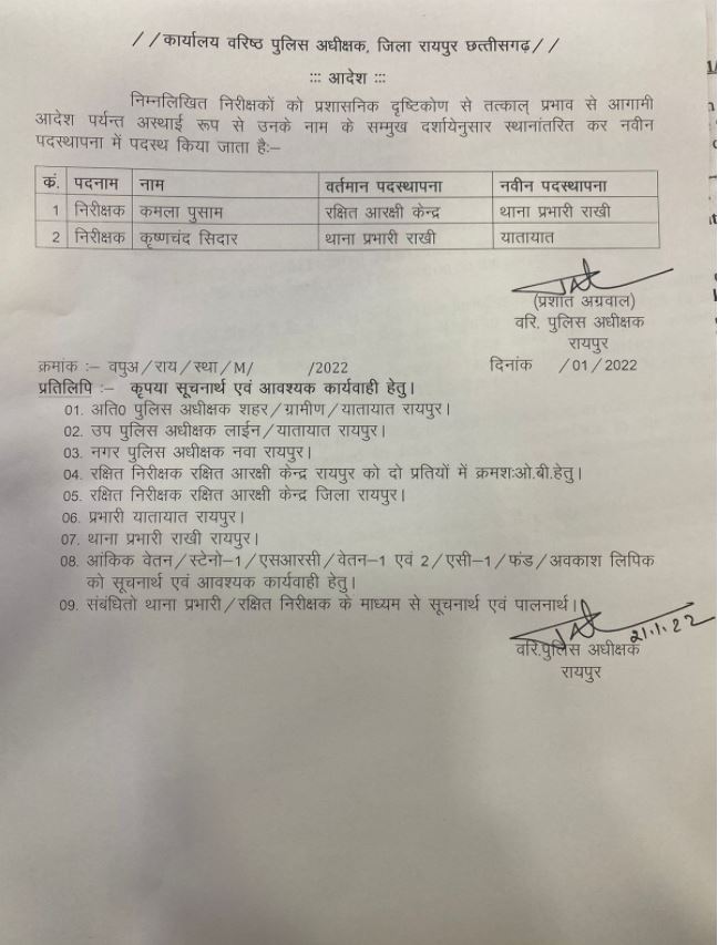 रायपुर: पुलिस विभाग में एक बार फि र से फेरबदल किया गया है। दो थाना प्रभारियों का तबादला हुआ है। इस तबादले की सूची में कमला पुसाम को रक्षित आरक्षी केन्द्र से थाना प्रभारी राखी बनाया गया है। वहीं कृष्णचंद सिदार को थाना प्रभारी राखी से यातायात रायपुर भेजा गया है। तबादले का आदेश एसएसपी प्रशांत अग्रवाल ने जारी किया है।
