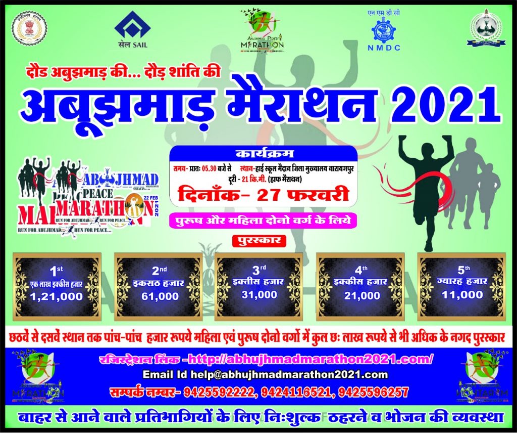 रायपुर: अबूझमाड़ में अब राज्य स्तर से लेकर राष्ट्रीय स्तर के खेलकूदों का आयोजन होने लगा है। नारायणपुर जिले में तीसरी बार अबूझमाड़ पीस हाफ मैराथन-2021 का आयोजन 27 फरवरी 2021 को किया जा रहा है। इस मैराथन में भाग लेने के लिए ऑनलाइन पंजीयन किया जा रहा है।
