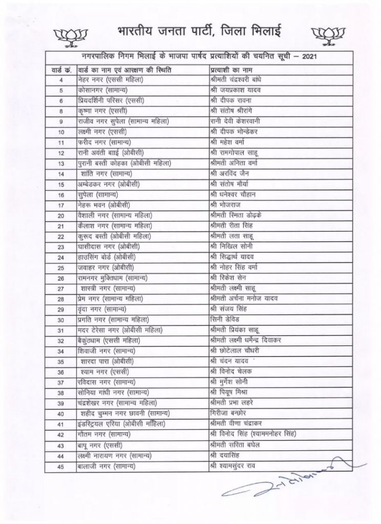 भाजपा ने भी नगरीय निकाय चुनाव के लिए भिलाई नगर निगम के प्रत्याशियों की सूची जारी कर दी है। देखें सूची…