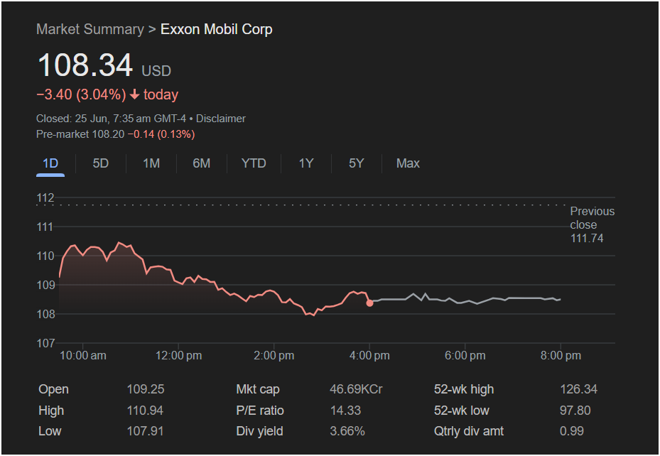 3.40, or 3.04%. The drop represents a significant deviation from its previous close of $111.74, indicating a strong shift in market sentiment against the energy giant.