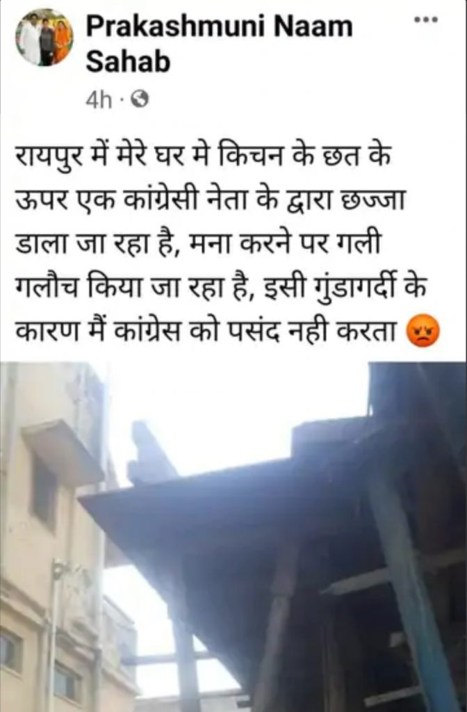 शनिवार को प्रकाश मुनी साहब ने अपने सोशल मीडिया एकाउंट से एक पोस्ट किया। इसमें उनके घर की छत के ऊपर अतिक्रमण की तस्वीर थी। इसके साथ उन्होंने लिखा, रायपुर में मेरे घर में किचन के छत के ऊपर एक कांग्रेसी नेता के द्वारा छज्जा डाला जा रहा है। मना करने पर गाली-गलौच किया जा रहा है। इसी गुंडागर्दी के कारण मैं कांग्रेस को पसंद नहीं करता।