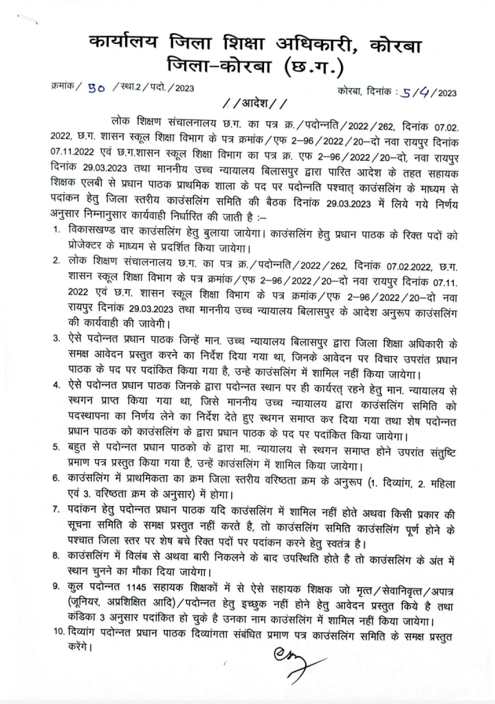 कोरबा : काफी दिनों से अटके प्रधान पाठक प्रमोशन की काउंसिलिंग डेट जारी कर दी गई है। 17 से 24 अप्रैल तक प्रमोशन की प्रक्रिया चलेगी। बिलासपुर हाईकोर्ट के निर्देश के बाद कोरबा में प्रधान पाठक प्रमोशन के लिए काउंसिलिंग डेट जारी हो गई है। कोरबा में सहायक शिक्षक एलबी से प्रधान पाठक प्राथमिक शाला के लिए प्रमोशन को स्थगित किये जाने के बाद कुछ लोगों ने इसे लेकर हाईकोर्ट में चुनौती दी थी। हाईकोर्ट के स्टे के बाद प्रमोशन की प्रक्रिया रूक गयी थी। अब कोर्ट का फैसला आने के बाद कोरबा जिले में प्रमोशन की प्रक्रिया शुरू हो रही है। 29 मार्च को जारी हाईकोर्ट के निर्देश के तारतम्य में हाईकोर्ट ने विकासखंडवार काउंसिलिंग की डेट जारी की है। प्रमोशन को लेकर 10 अलग-अलग बिंदुओं को जारी किया गया है। कोरबा जिला शिक्षा अधिकारी ने कहा है कि इन निर्देश के मुताबिक ही प्रमोशन की प्रक्रिया होगी। 17 से 24 अप्रैल तक प्रमोशन की प्रक्रिया चलेगी।