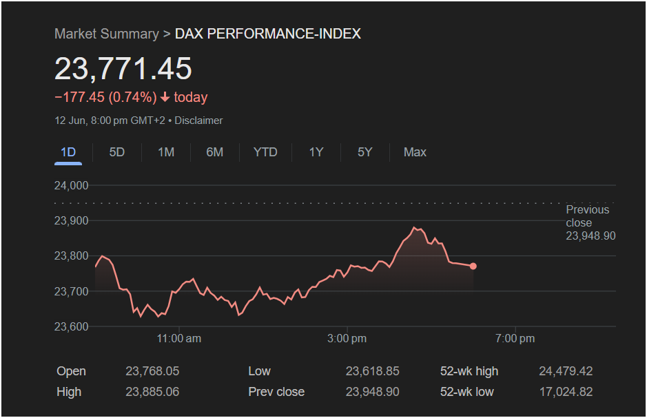 The DAX Performance Index saw a noticeable pullback on June 12, 2025, closing at 23,771.45, which is down 177.45 points or 0.74 percent from the previous day. This signals a cautious mood among European investors and raises an important question — is this a buying opportunity or the start of deeper weakness?