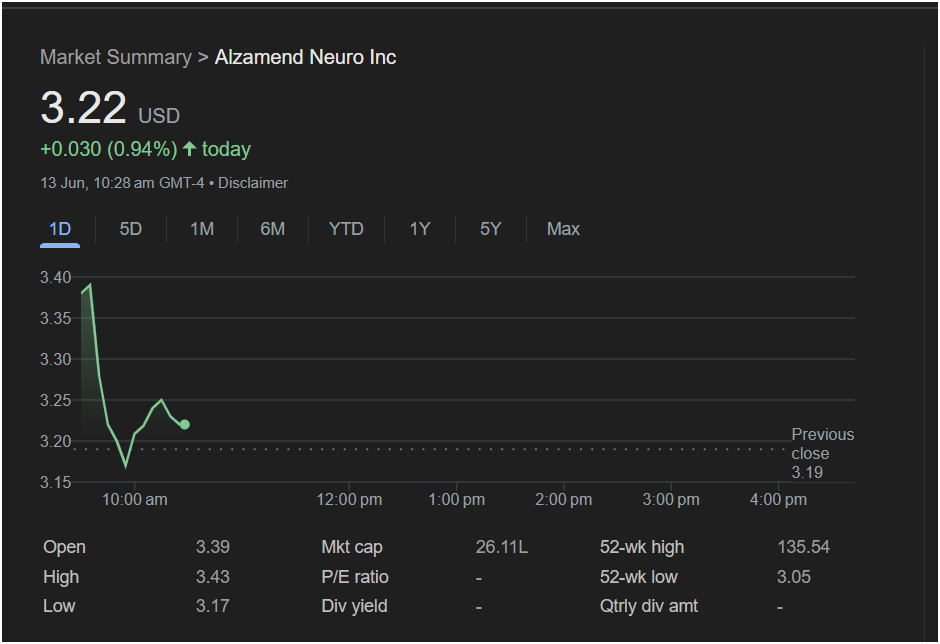 The Alzamend Neuro Inc. stock is showing a gain on the screen today, but a closer look at its intraday price action reveals a potentially bearish pattern that traders must be aware of. While technically in the green, the stock’s performance after the market open tells a story of significant volatility and selling pressure. This analysis, based on a market snapshot from June 13th at 10:28 AM GMT-4, will dissect every critical data point to provide a comprehensive guide for traders evaluating this high-risk stock.