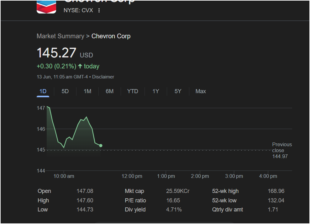 As of 11:05 am GMT-4 on June 13th, the market data for Chevron is as follows: