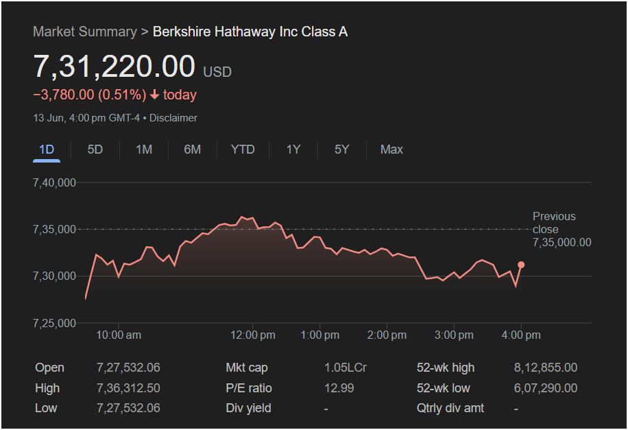 Shares of Berkshire Hathaway Inc. Class A (NYSE: BRK.A) declined by $3,780 or 0.51% on Thursday, closing at $731,220. The stock opened at $727,532 and reached an intraday high of $736,312, but downward pressure throughout the afternoon pulled it into negative territory.