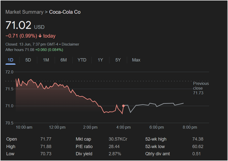 The most telling indicator, however, came after the closing bell. In after-hours trading, Coca-Cola ticked up to $71.08, a modest but psychologically important gain. This positive momentum suggests that market sentiment shifted in favor of the bulls once the day’s selling pressure had subsided.