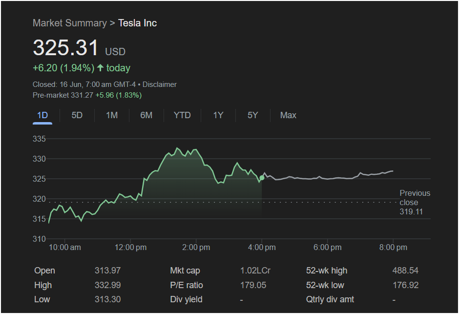 • P/E Ratio: At 179.05, the Price-to-Earnings ratio is extremely high, reflecting market expectations of significant future growth rather than current earnings. This is a key characteristic of growth stocks like Tesla.