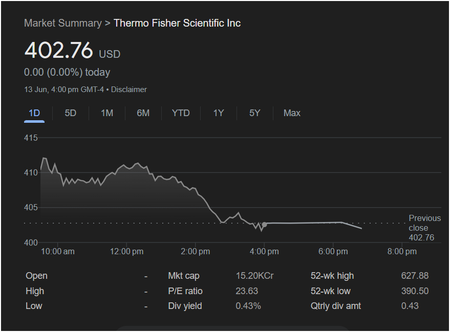 • P/E Ratio (23.63): A Price-to-Earnings ratio of 23.63 is moderate for a company of Thermo Fisher’s stature. It doesn’t suggest the stock is excessively overvalued, meaning the current sell-off may be driven more by market sentiment or industry-specific headwinds rather than a valuation bubble.