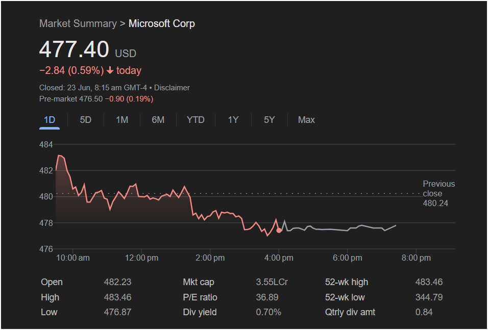 Microsoft Corp (NASDAQ: MSFT) closed lower on Friday, June 23, falling by 0.59% (-$2.84) to end the day at $477.40. Despite briefly touching a new 52-week high of $483.46, the stock struggled to hold gains, reflecting profit-booking and broader market uncertainty. This move brings Microsoft stock into sharp focus for traders anticipating Monday’s market action.