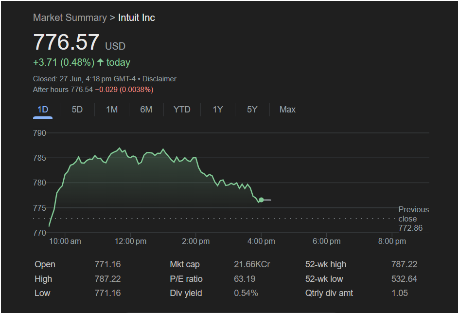 The market opened with strong buying pressure for Intuit, with the stock immediately gapping up from its previous close of $772.86 to an opening price of $771.16 (which also served as the day’s low). Bulls remained firmly in control through the morning, driving the price to a new 52-week high of $787.22 around midday. This milestone signaled significant investor confidence and continued the stock’s powerful upward trend.