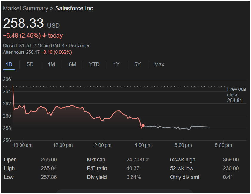 SAN FRANCISCO, CA — Shares of Salesforce Inc. (NYSE: CRM) fell sharply on Thursday, July 31, closing at $258.33, a drop of 2.45%, even as the broader market posted modest gains. The decline followed the announcement of a massive $1.5 billion joint AI investment with ServiceNow in Genesys Cloud Services, highlighting both Salesforce’s aggressive AI ambitions and Wall Street’s mixed reaction to bold, long-term plays in an increasingly competitive landscape.