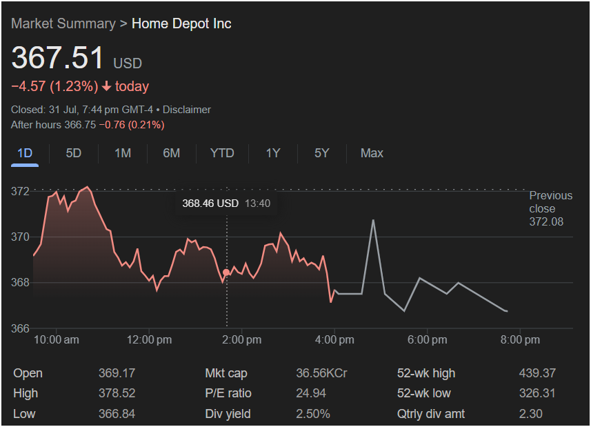 In contrast, Home Depot closed Thursday down 1.23% to $367.51, reflecting concerns about the health of the housing market and consumer spending. The stock swung from a high of $378.52 to a low of $366.84 in the session.