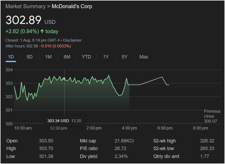 With a solid track record of dividend growth, a promising tech-forward strategy, and upcoming earnings that could show strength despite macroeconomic headwinds, McDonald’s is positioned as a defensive yet dynamic investment. The current price is still below its 52-week high, suggesting potential room for upside, especially if Q2 results impress.