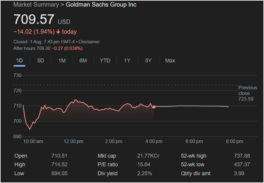 NEW YORK, NY – August 1, 2025 — Shares of Goldman Sachs Group Inc. (NYSE: GS) edged lower in Friday’s trading session, closing down 1.94% at $709.57, despite a backdrop of robust earnings and ongoing institutional strength. The move adds complexity to the stock’s recent trajectory as investors weigh macroeconomic uncertainty against the firm’s solid fundamentals.