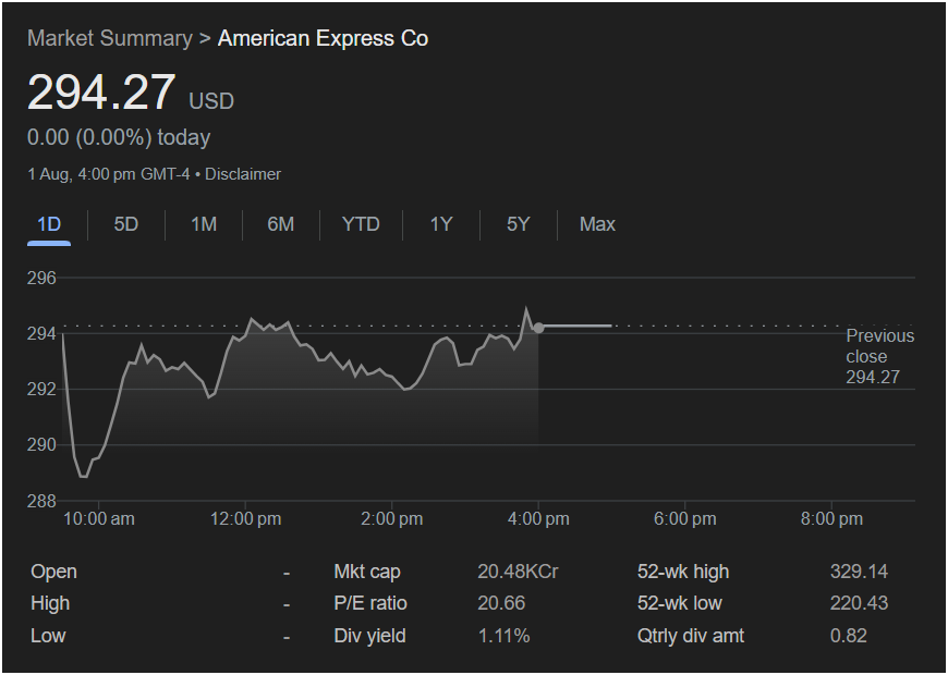 NEW YORK, NY — American Express Co. (NYSE: AXP) closed flat at $294.27 on Thursday, August 1, as a day of intraday swings gave way to a motionless finish. The unchanged close masks a session marked by volatility, with the stock trading between $288.34 and $294.91, reflecting investor hesitation in the face of economic headwinds and sector-wide uncertainty.