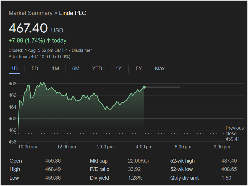 WOKING, UK – August 4, 2025 – Shares of Linde PLC (NASDAQ: LIN) experienced a robust trading day, closing at $467.40, a significant gain of $7.99 or 1.74%. The industrial gases and engineering titan saw its stock open at $459.86 and reach an intraday high of $468.49, demonstrating strong investor confidence following a series of positive financial disclosures and optimistic analyst ratings.