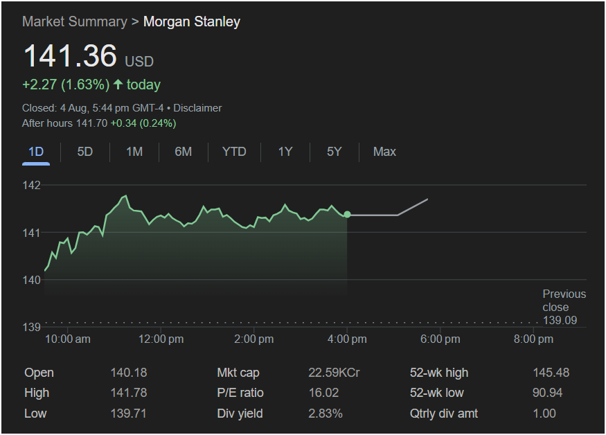 NEW YORK – Morgan Stanley (MS) demonstrated robust health in the financial markets, with its stock closing at $141.36, a notable increase of 1.63% for the day. The positive momentum continued in after-hours trading, with the share price inching up a further 0.24% to $141.70. This upward trajectory comes on the heels of a strong quarterly performance and an optimistic outlook for the financial sector, positioning the investment banking giant favorably in a complex economic environment.