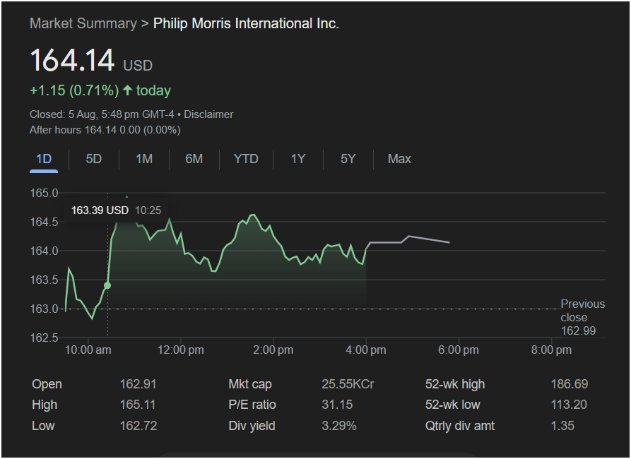 NEW YORK – Shares of Philip Morris International (NYSE: PM) ended a volatile trading day on a high note on Tuesday, August 5, closing at $164.14. This marks a daily increase of $1.15, or 0.71%. The stock showed resilience, recovering from an early low to finish near the day’s peak.