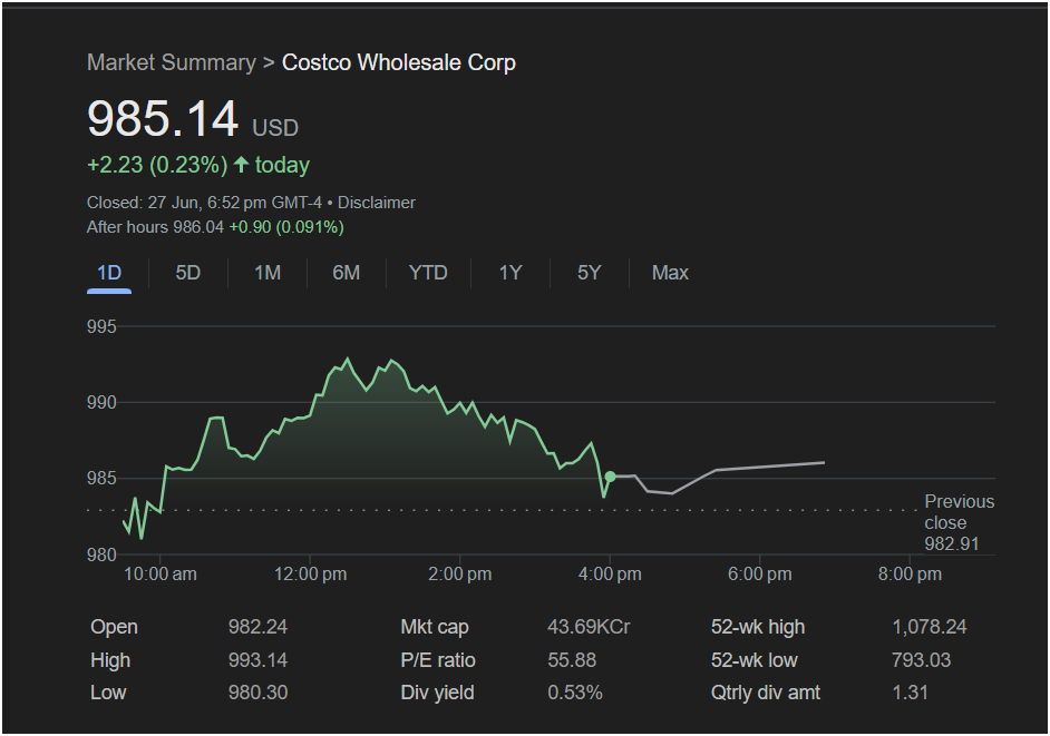 2. Weak Close: Unlike a stock that closes near its high, Costco closed much closer to its opening price than its peak. This suggests that the negative momentum from the afternoon sell-off is what will carry into the next trading day, not the positive momentum from the morning.