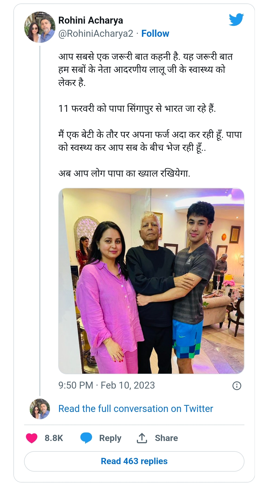 बता दें कि पांच दिसंबर 2022 को सिंगापुर के माउंट एलिजाबेथ अस्पताल में लालू यादव के किडनी का प्रत्यारोपण हुआ था। लालू की दूसरे नंबर की बेटी रोहिणी ने पिता को अपनी एक किडनी डोनेट की थी। रोहणी आचार्य अपने पति और बच्चों के साथ सिंगापुर में ही रहती हैं। पिता को किडनी देने को लेकर लालू यादव की दूसरे नंबर की बेटी रोहिणी आचार्य की हर तरफ सराहना भी हुई थी।