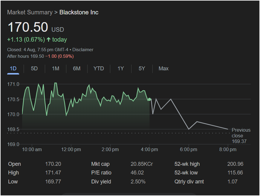 New York, NY – August 5, 2025 – Blackstone Inc. (NYSE: BX), the world’s largest alternative asset manager, saw its stock navigate a choppy trading session on Monday, ultimately closing with a modest gain before retreating in after-hours trading. The stock finished the official session at $170.50, up 0.67%, a rise of $1.13 for the day. However, the positive sentiment appeared to wane after the bell, with shares dipping $1.00, or 0.59%, to $169.50 in later trading.