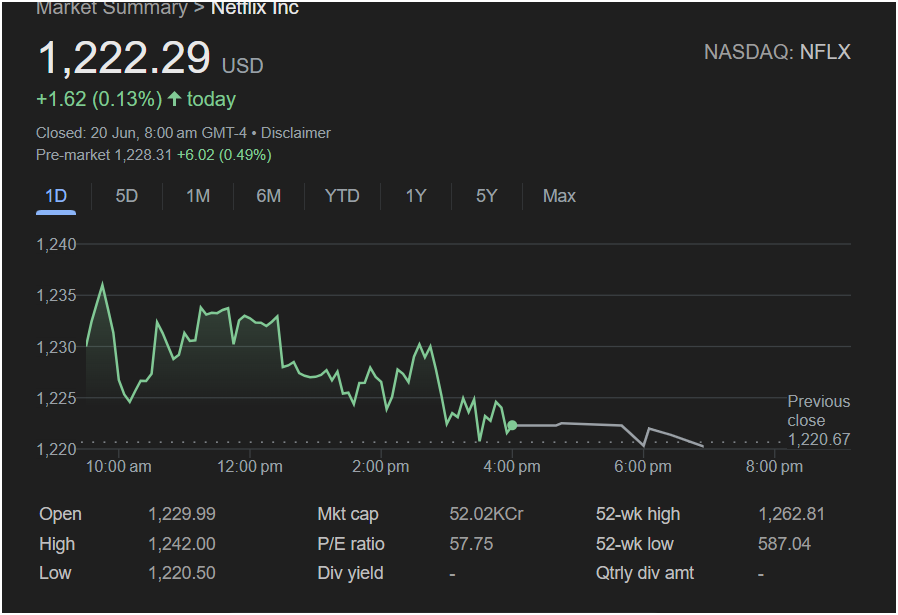On Thursday, June 20th, Netflix stock was a battleground for bulls and bears, ultimately ending in a near stalemate. Here is a summary of the session’s key numbers: