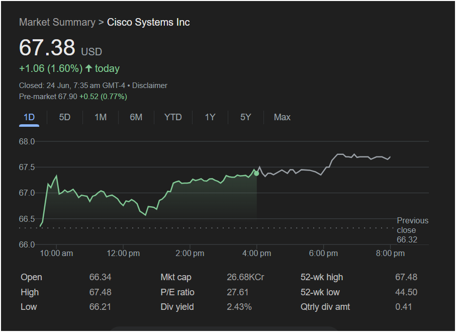 The market summary shows Cisco Systems Inc. ended the last trading day at 67.38 USD, posting a solid gain of $1.06 (1.60%). The stock traded in a healthy range, opening at